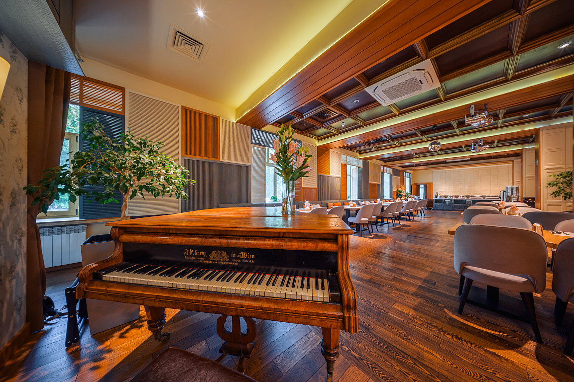 Просторный зал с панорамными окнами, где приятно начинать день с завтрака, наслаждаться обедом или провести вечер