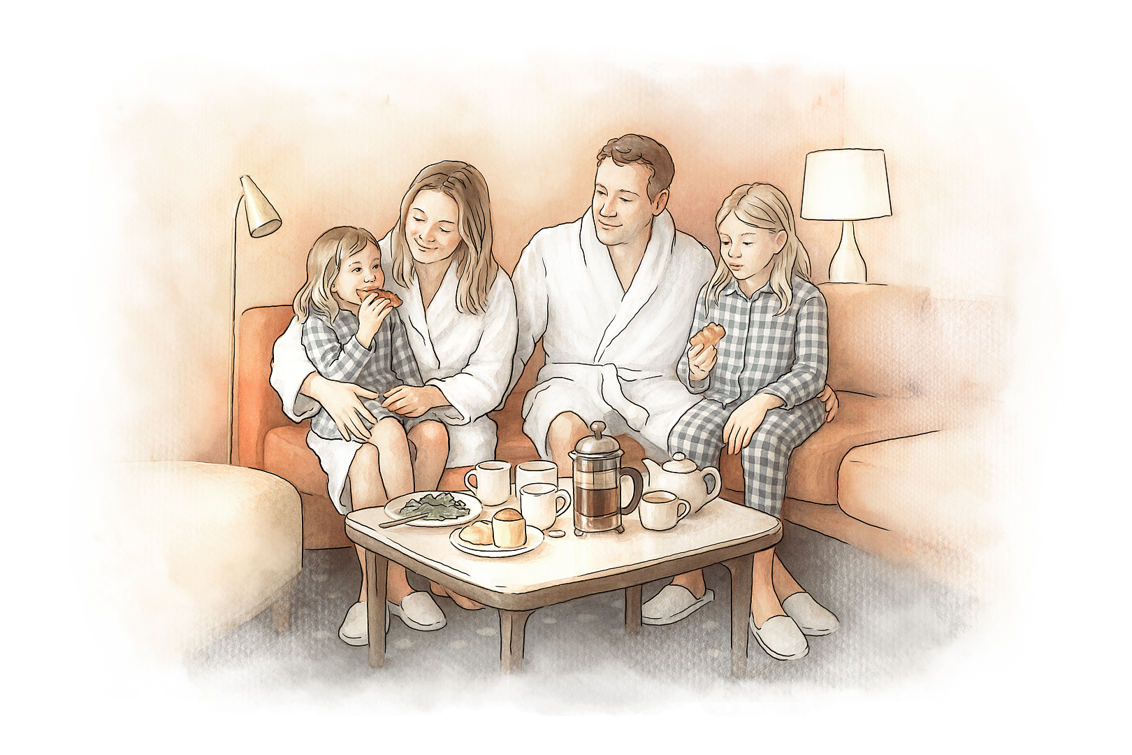 2 взрослых + 2 ребенка до 14 лет, либо 3 взрослых и 1 ребенок до 14 лет.