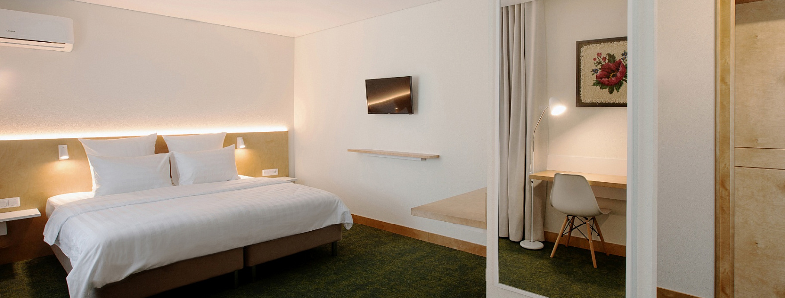 Просторный номер для размещения не более двух Гостей. Номер с двуспальной кроватью, раскладным диваном, шкафом для одежды, телевизором, с планировкой, позволяющей использовать часть помещения в качестве гостиной или кабинета. Отдельная ванная комната со всеми необходимыми принадлежностями.